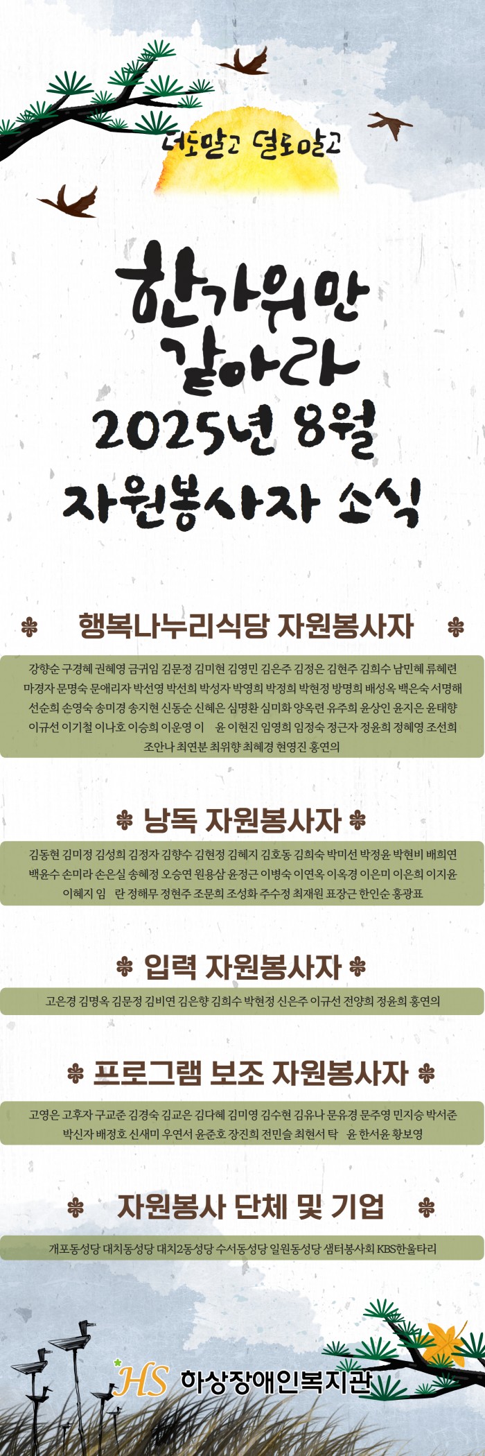 2025년 8월 자원봉사소식 작성자 이정곤 조회 104회 작성일 25-09-29 19:50 본문 2025년 8월 자원봉사소식입니다.이제 곧 민족의 대명절 추석입니다.하상장애인복지관과 함께 하시는 자원봉사자 여러분들에게감사의 인사를 전합니다.다들 풍성한 한가위 되세요! 목록 이전글2025년 9월 자원봉사 소식 25.10.31 다음글2025년 7월 자원봉사 소식 25.08.14