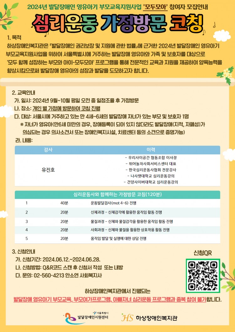 하상장애인복지관은 「발달장애인 권리보장 및 지원에 관한 법률」에 근거한 2024년 발달장애인 영유아기 부모교육지원사업을 위하여 서울특별시에 거주하는 발달장애 영유아와 가족 및 보호자를 대상으로 ‘모두 함께 성장하는 부모와 아이-모두모아’ 프로그램을 통해 전문적인 교육과 지원을 제공하여 양육능력을 향상시킴으로써 발달장애 영유아의 성장과 발달을 도모하고자 합니다.