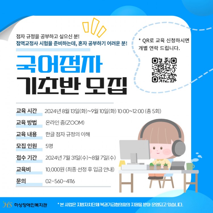 하상장애인복지관에서 2024년 하반기 국어점자 기초반 수강생을 모집합니다.