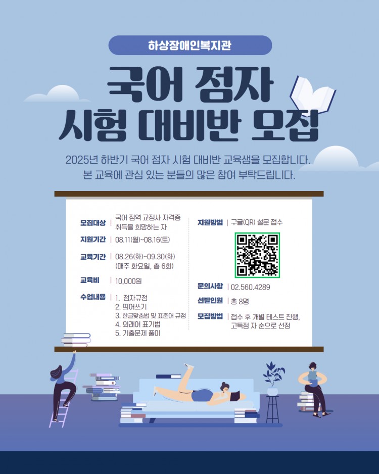 하상장애인복지관에서는 2025년 하반기 국어 점자 시험 대비반 교육생을 모집하고자 합니다.