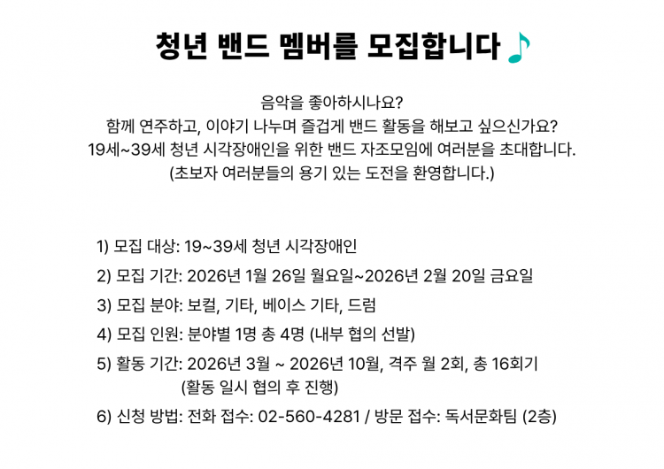 19세~39세 청년 시각장애인을 위한 밴드 자조모임에 여러분을 초대합니다.