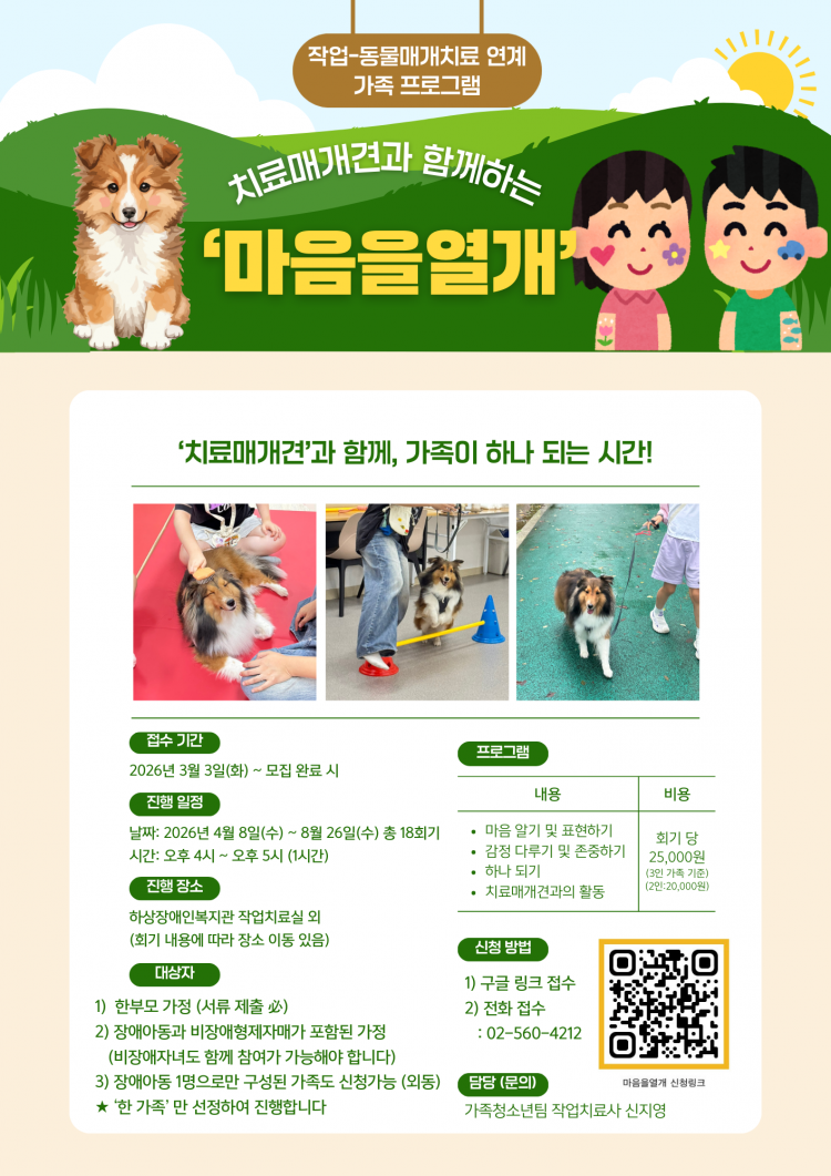 작업-동물매개치료연계 가족프로그램 '마음을열개' 참여자 모집 (신청조건완화)