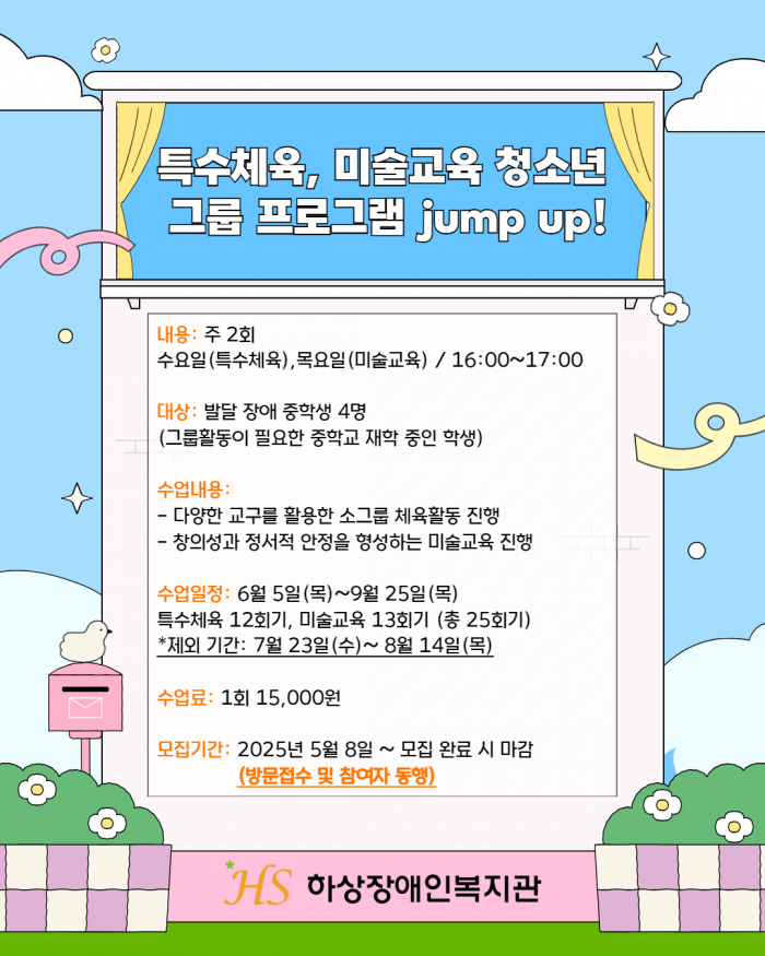 하상장애인복지관 가족청소년팀은 2025년 청소년 및 가족 프로그램에 대한 욕구조사 결과를 바탕으로, 발달장애 중학생 청소년을 위한 소그룹 체육 및 미술교육 프로그램 「Jump Up!」을 기획하였습니다. 신체활동과 예술적 표현을 통해 또래와 자연스럽게 소통하고 성장을 경험할 수 있는 본 프로그램에 많은 관심과 참여를 바랍니다.