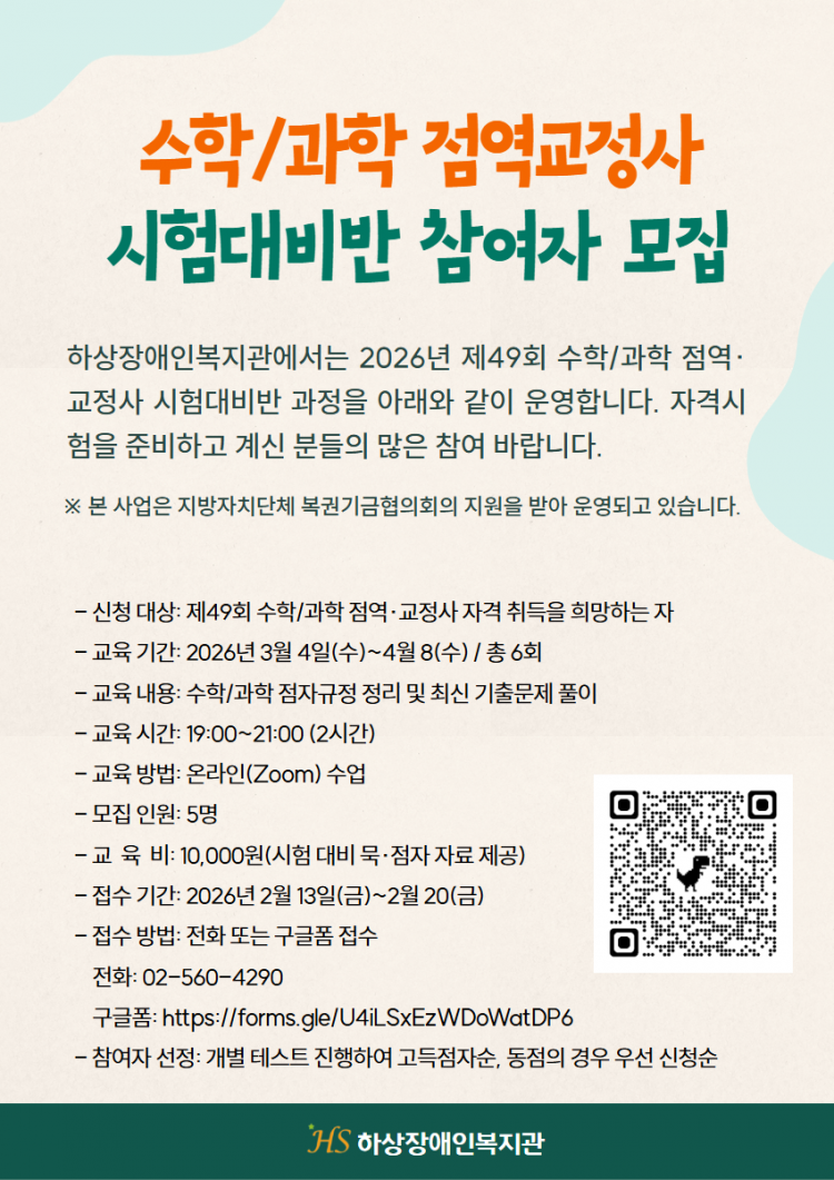 하상장애인복지관에서는 2026년 제49회 "수학/과학 점역·교정사" 시험대비반 과정을 아래와 같이 운영합니다.